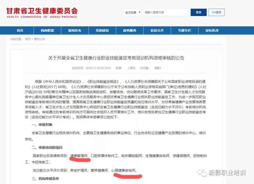 健康管理师是国家第四批正式发布的新职业,自2017年11月份正式由人社部划至国家卫健委并由国家卫健委开展全国职业技能鉴定工作。为了积极响应国务院印发《关于促进健康服务业发展的若干意见》(【2013】40 号)第七条明确要求健全人力资源保障机制,规范并加快培养健康管理师等从业人员以及推动《健康中国2030》战略,满足我国健康管理行业快速发展以及对健康管理人才和相应资质认证的迫切需求,切实做好城乡居民健康管理工作,提升基层医疗机构服务水平和健康体检质量管理水平,加强健康管理人才队伍建设,国家卫生计生委人才交流服务中心负责开展《健康管理师》的职业技能鉴定相关工作,是该职业国家职业资格唯一的认证单位,甘肃新影职业培训学校甘肃省认定的考前培训机构,卫健委《健康管理师》国家职业资格鉴定考试培训报名招生中...